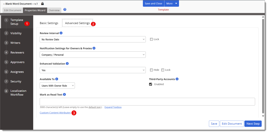 Custom Content Attributes are available for Document, Assessment and Campaign templates. System Administrators and users with the Template role assigned can add these attributes to content templates. Custom Content Attributes can be hidden, locked and set as required at the template level. Once the custom content attributes have been added to the template, the content owner can then apply the template to their content item.