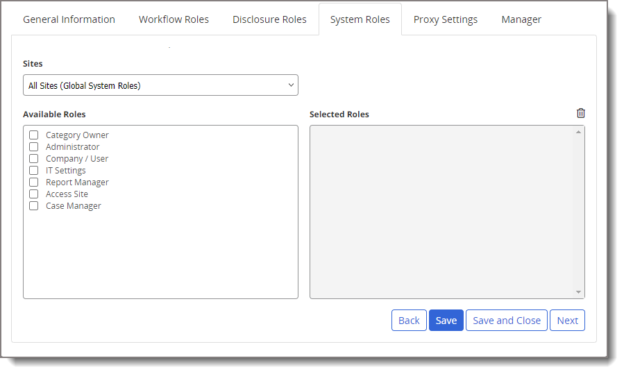 - If you want this user's assigned permissions to apply to all sites, click All Sites (Global System Roles).