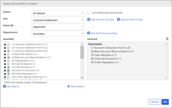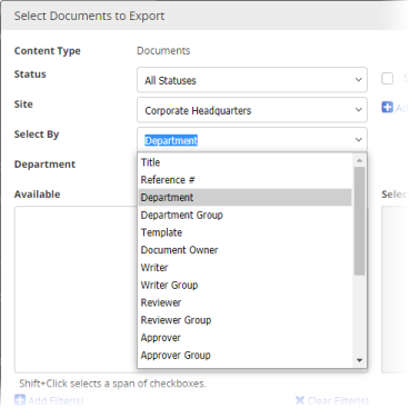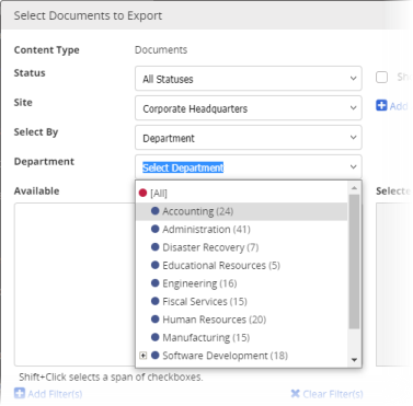 - If you chose any of the other Select By options, in the field below Select By, click an item to display all documents assigned to that item. For example, if you chose Department for Select By, then in the Department list, click a department to display all documents assigned to that department or click Add All From [department name].
