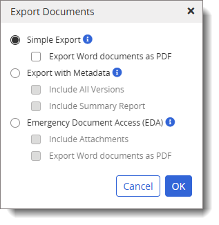 The process for selecting documents for a simple export or an export with metadata consists of displaying a narrowed list of documents and then selecting from that list the documents you want to export. The export file for a simple export contains documents in their original file format and can include Word documents in PDF format. The export file for documents with metadata includes an Excel spreadsheet containing information about each document (document owner, task assignees, date created, and the like). This includes a Summary Report and All Versions option.