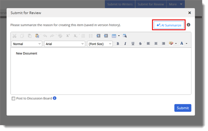 Select Enable AI Summarization to activate the AI Summarize feature. This feature allows Document Owners publishing the first version of a document to generate the Change Summary text using AI when submitting a document for review, approval, or setting as approved.