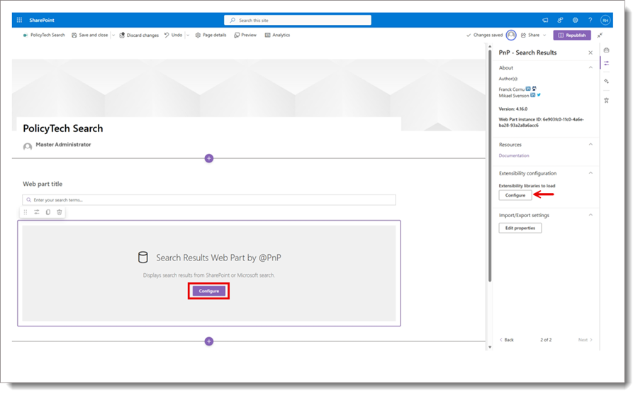 In the PnP Search Results window, select Next, and then Configure under Extensibility Configurations.