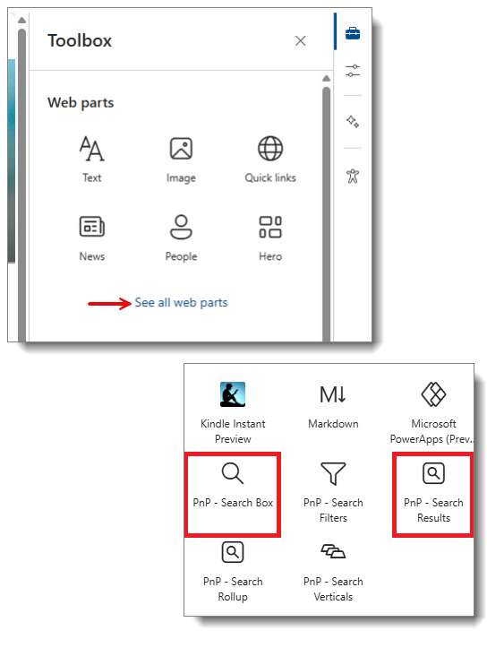 Select PnP - Search Box and PnP - Search Results from the Web Parts list.