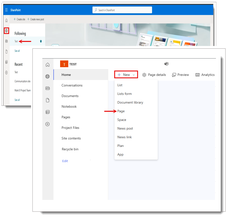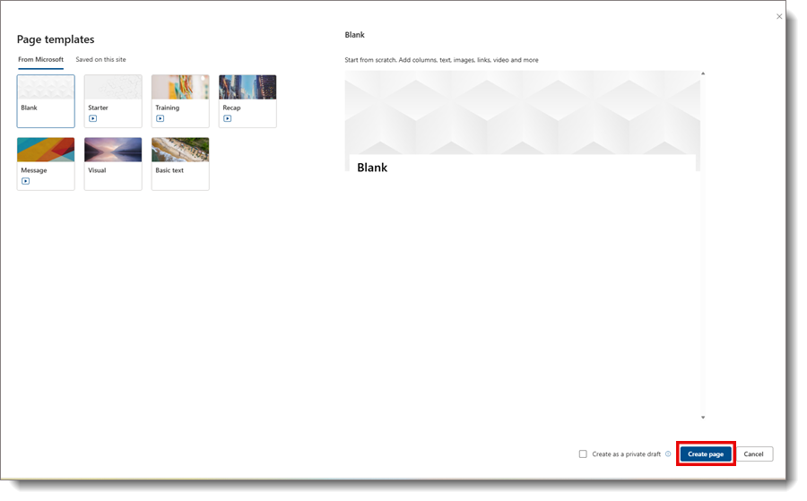 Tip: You can also create a new page by selecting the Create icon, and then selecting Page.