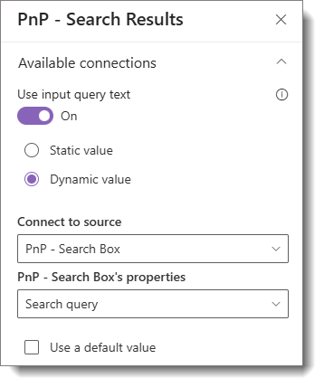 Select Search Box from the Connect to Source text list and Search query from the PnP Search Box's properties list.