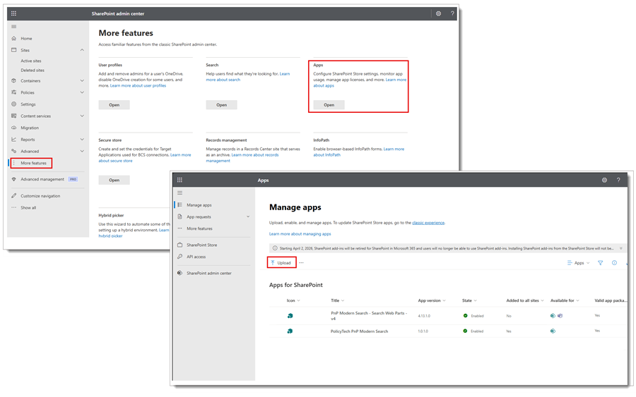 In the Manage apps page, select Upload, and then select your downloaded PolicyTech Search and PnP Modern Search SharePoint packages. Once the packages are uploaded, the app list displays the newly uploaded apps.