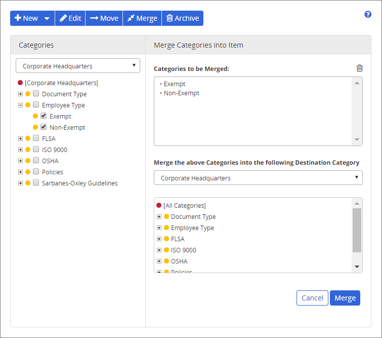 When merging one or more categories or subcategories into another category or subcategory (the target), all the subcategories, templates, and content items (documents, assessments, and campaigns) assigned to the categories/subcategories to be merged will be reassigned to the target category/subcategory. The categories/subcategories to be merged will then be deleted, with the target category/subcategory remaining.