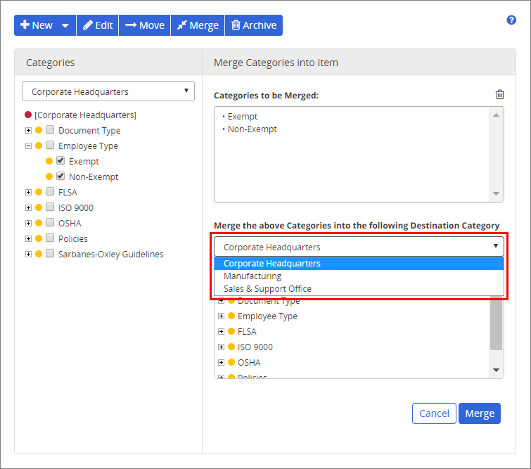 - To merge the selected categories or subcategories under another category or subcategory, select it.