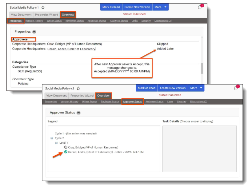 You can determine if a user has been added as an approver after publication and completed their task by reviewing the document Overview tab, the Task by Content - All Tasks report, and the Inserted Field Properties.