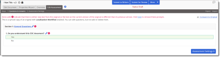 alert is hidden for a specific piece of text once it is modified in any way and no longer matches the text in the original assessment. - At any time while working on the assessment you can click Compare to Original to open the original assessment in a separate browser window.