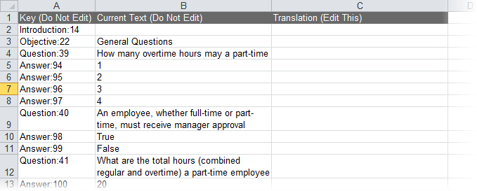 - In the Translation (Edit This) column, type the translations for or modifications of the text in the Current Text (Do Not Edit) column. To use a piece of current text as it is, leave its corresponding translation cell empty.