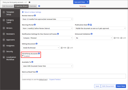 A third-party contact can be designated as a writer, reviewer, or assignee when creating a document or questionnaire. However, a document owner can assign third-party contacts to a document/questionnaire only after you enable that functionality in the template assigned to that document/questionnaire.