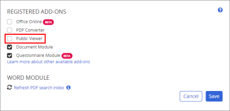 - If you have the Public Viewer module, you'll see it listed in the Registered Add-ons area. Select Public Viewer, and then click Save.