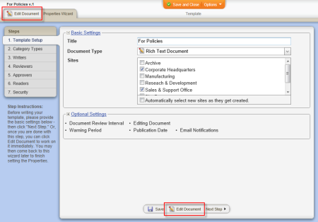 - If you currently have the template open and have the Properties Wizard tab selected, click the Edit Document tab near the upper left corner or the Edit Document button at the bottom of the currently displayed Properties Wizard step.