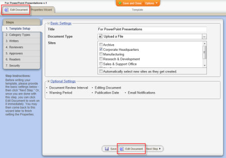 - If you currently have the template open and have the Properties Wizard tab selected, click the Edit Document tab near the upper left corner, or the Edit Document button at the bottom of the currently displayed Properties Wizard step.