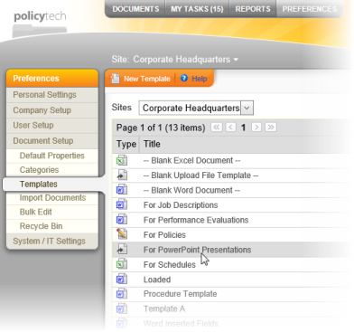 Note: Besides Word® and Excel®, PolicyTech™ supports the upload and launching of Microsoft PowerPoint® (.pptx, .ppt) and Microsoft Visio® (.vsd, .vss, .vst, .vdx, .vsx, .vtx, .vsw) file types. You can enable the launching of any other file type. See Setting Up Document Access for details.