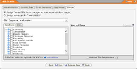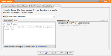 If one or more managers have already been selected for this user's department, they will be listed in the Selected Users box.