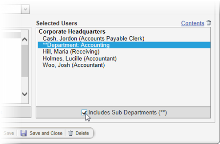 Important: By default, selecting a department makes the user manager of that department only. If you want the user to also manage any subdepartments of the selected department, in the Selected Users list, click the department name, and then select the Includes Sub Departments check box.