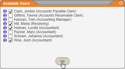 - In the Departments tab, click a department name, select the check boxes of one or more users, and then click OK.