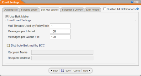 The Bulk Mail Settings tab lets you enable and disable two different methods—Bulk Mailer and Distribute by BCC—for controlling the email processing load on the PolicyTech™ server.