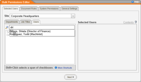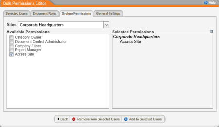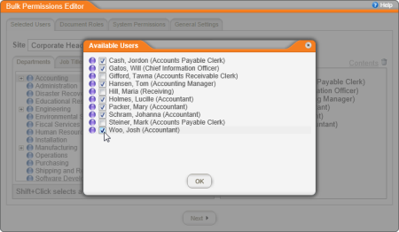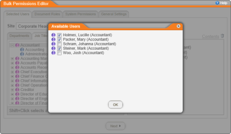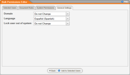 Use the Bulk Permissions Editor to assign and remove document roles and system permissions and to change general settings for multiple users at once.