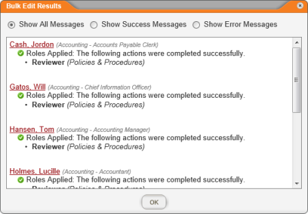 A window appears with the results of the action you selected. All messages are shown by default. You can choose to show only success messages or only error messages.