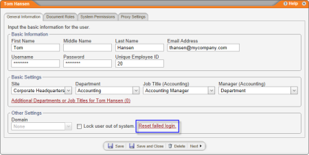 - In the Other Settings area of the General Information tab, click Reset failed login.