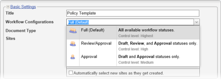 - Full (Default): Includes all available workflow steps—draft, collaboration (for assigning writers), review, and approval—leading up to a document being published.