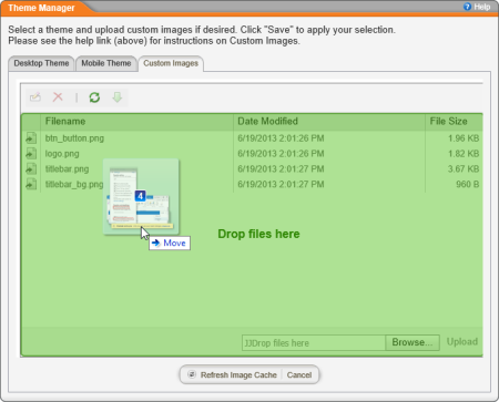 Important: Uploaded graphic files always override the current built-in theme setting. The only way to use the built-in themes again is to delete all the uploaded graphic files (see Changing or Deleting a Custom Theme).