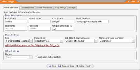 - Make the necessary changes in the General Information, Document Roles, System Permissions, and Proxy Settings tabs. See Adding a User Manually, Assigning Document Roles, Assigning System Permissions, and Assigning a Proxy Author for details on user information and assignments.