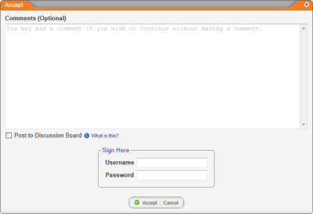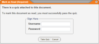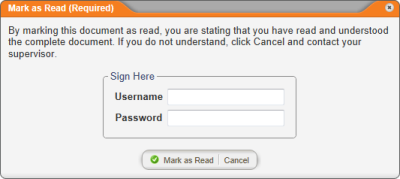 When this feature is enabled, a user must enter his or her user name and password (an electronic signature, in effect) in order to complete a task, such as marking a document as read, accepting a document in review, or approving a document. In the case where a kiosk computer is the point of general PolicyTechâ„¢ access under a generic service account, this feature provides verification that the intended user has completed a task.