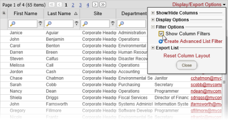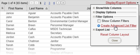- Click Display/Export Options, click Filter Options, and then click Create Advanced List Filter.
