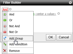 - To add a group, click the operator under which you want to add a group, and then click Add Group. The new group is a subgroup of (indented below) the one above it. In other words, in the filter hierarchy the added group is a child of its parent group.