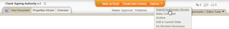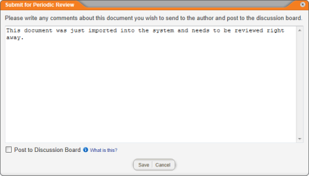 You can set an approved document as immediately due (today) for review. Doing so creates a periodic review task and sends the document owner two emails. One is the email usually sent at the beginning of the periodic review warning period (see Take Action on a Document Due for Periodic Review for details) and includes a due date of the day you force the periodic review submission. The second email indicates that you have submitted the document for periodic review and includes the message, if any, that you include when you force the periodic review.