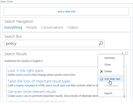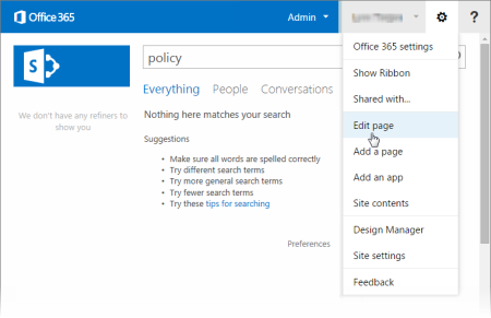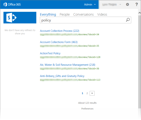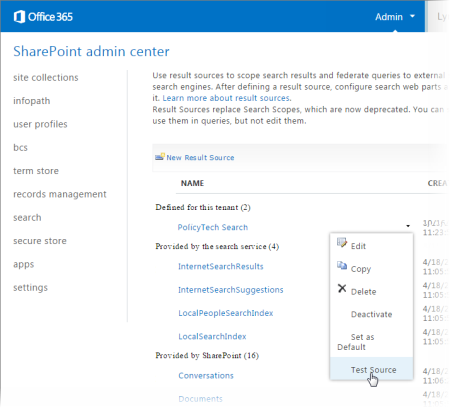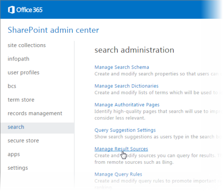 Important: The instructions that follow are one example of how to configure SharePoint using Office 365™. If you're using a different administration tool, your steps and screens may be different than those below. You may also choose different options to set up your Search Result Source.