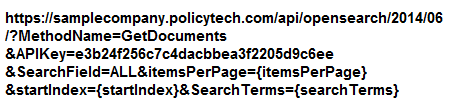 https://[your PolicyTech URL]/api/opensearch/2014/06/?MethodName=GetDocuments&APIKey=[PolicyTech API key]&SearchField=ALL&itemsPerPage={itemsPerPage}&startIndex={startIndex}&SearchTerms={searchTerms}