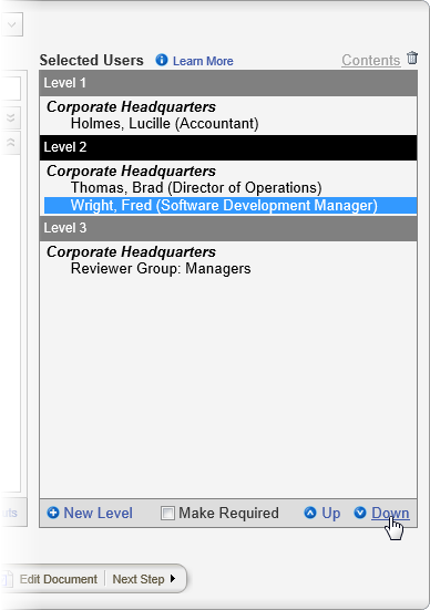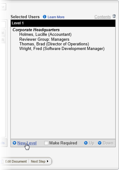 Notice in the screenshots above that a black Level 2 heading appears. The black color indicates that this level is now active. Any additional users selected at this point are added to Level 2. To make Level 1 active again, click the Level 1 heading.