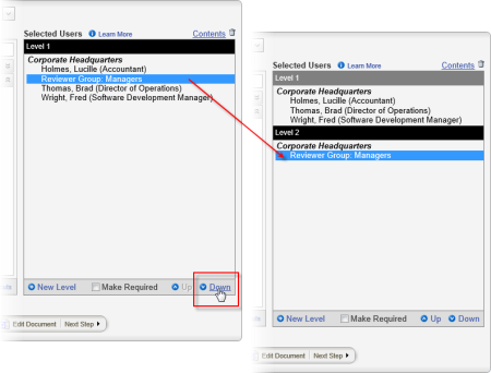 When you assign writers, reviewers, and approvers to a template in the Properties Wizard, you can create levels to specify which users get the document first, second, and so on. When you create multiple levels, all users on the first level must complete their tasks, such as reviewing the document, before the same task can be sent to the users at the next level.