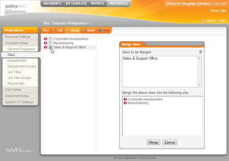 Important: A site that is merged into another is not placed in the Recycle Bin and can only be restored by restoring a backup database. Be sure to back up the PolicyTech™ database when prompted (see step 4 below).