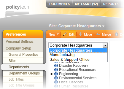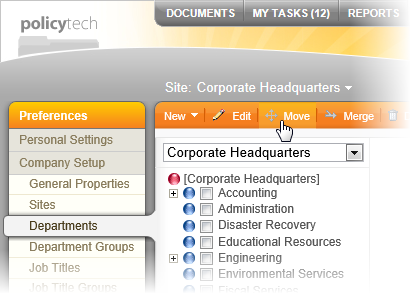 - In the site list above the department list on the left, click the site containing the department or departments you want to move.