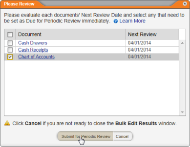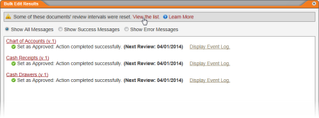 If the periodic review date for one or more documents was reset as a result of clicking Submit for Period Review in the Bulk Editor, you will see an alert at the top of the Bulk Edit Results window, as shown below. Click View the list to see which documents' review intervals were reset.