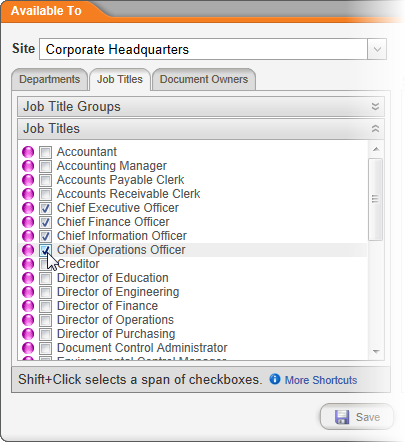 Important: The remaining entities that you can assign have special properties. If you assign a job title or department, or a group of job titles or departments, all document owners, and only document owners, with those job titles or within those departments will be given access to documents created from this template. If document owners are added to or removed from the selected job titles or departments, the access permissions are automatically updated.