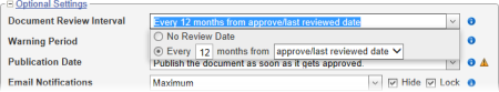 - approve/last reviewed date: Sets the review date the number of specified months after the document is approved for version 1 and after the previous review date for all subsequent versions.