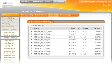 - To restore a backup that you've downloaded to a local drive, you must upload it back into PolicyTech first. See Managing Backups.