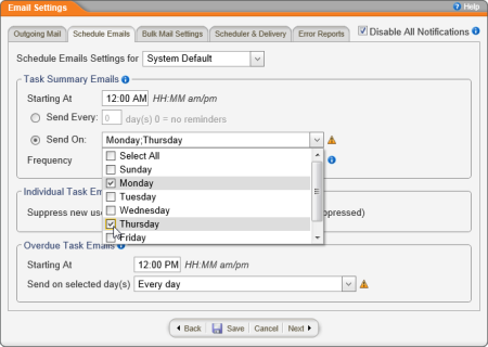 Note: To turn off task summary emails completely, select Send Every, and then type 0.