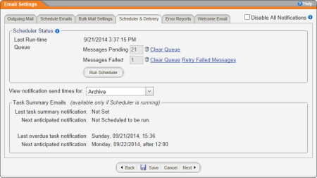 The PolicyTechâ„¢ Scheduler does the work of sending queued task emails through your organization's email system. The Scheduler & Delivery tab shows the status of Scheduler, including the number of messages pending and failed, the last and next task summary notification time, and the last and next overdue task notification.