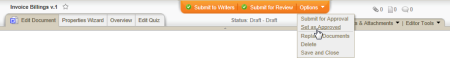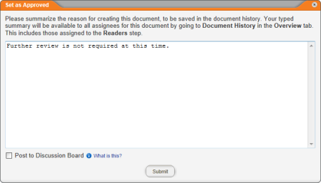 There may be times when a document control administrator (DCA) or document owner will need to set a document as approved without going through the normal review and approval process. For example, documents may have already been reviewed and approved outside of PolicyTechâ„¢ and therefore do not need to be reviewed and approved after importing them. A document owner must also have the approver role assigned to be able to do this. In addition, there must not be any other required approvers assigned to the document. The DCA or document owner who completes the Set As Approved action will be listed in the Approver Status page as having approved that document, and any other reviewers and approvers who have not completed their assigned tasks will show the skipped status.