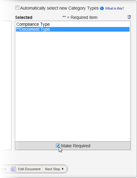 1. (Optional) The category types you've added are optional, and the document owner can treat them as suggestions. To make a category type required, in the Selected box, click the category type, and then click Make Required. The two asterisks indicate that the category is required. Document owners using this template must now select one or more categories of that type.