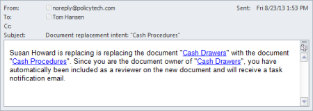 [document owner's name] is replacing the document "[replaced document title]" with the document "[replacement document title]". Since you are the document owner of "[replaced document title]", you have automatically been included as a reviewer on the new document and will receive a task notification email. |