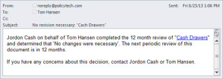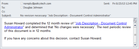 [action taker's name]* completed the [integer] month review of "[document title]" and determined that 'No changes were necessary'. The next periodic review of this document is in [integer] months. If you have any concerns about this decision, contact [contact's name]†.